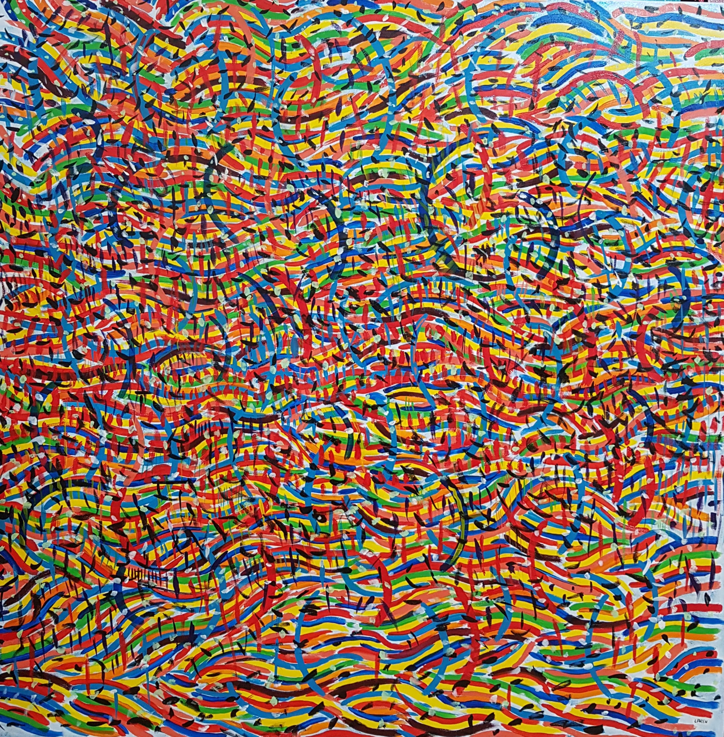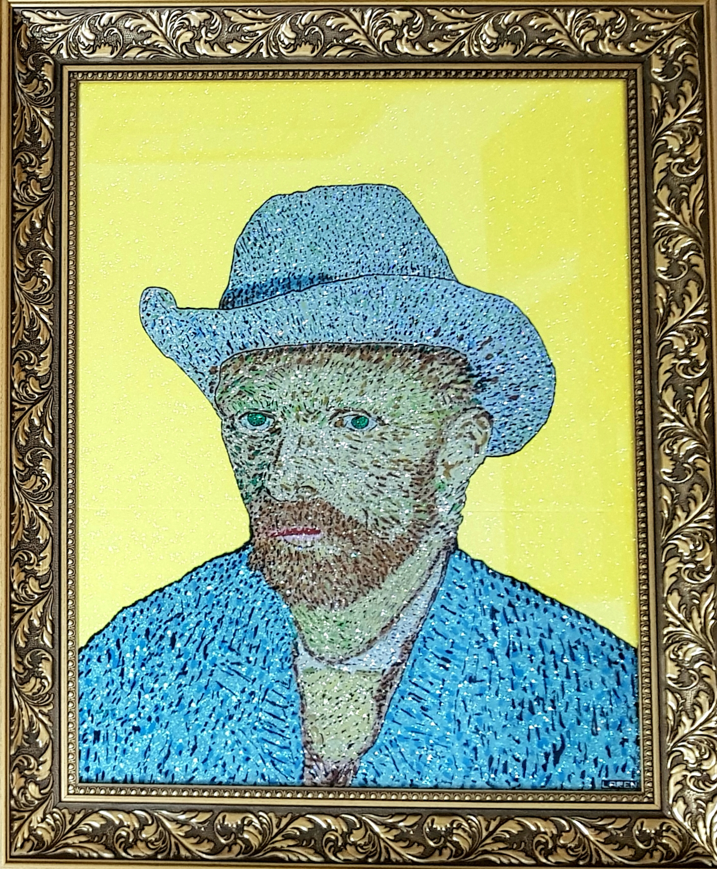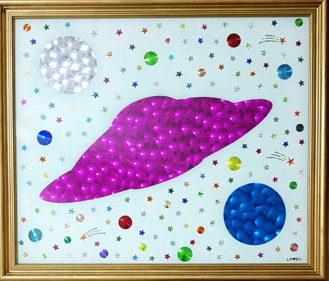 El creador del país imaginario “Larenland”, utiliza una amplia gama de materiales y objetos: resina, esmaltes, purpurina, glitter, vidrio líquido, papel espejo y holográfico, mostacillas, monedas e imágenes. Elementos que, debido a su brillo y su textura, dan a su obra cierta cualidad cinética, ya que cambian según la luz y el ángulo de observación. Elaboró su técnica a partir de su formación en el campo de la química mientras experimentaba con la pintura.