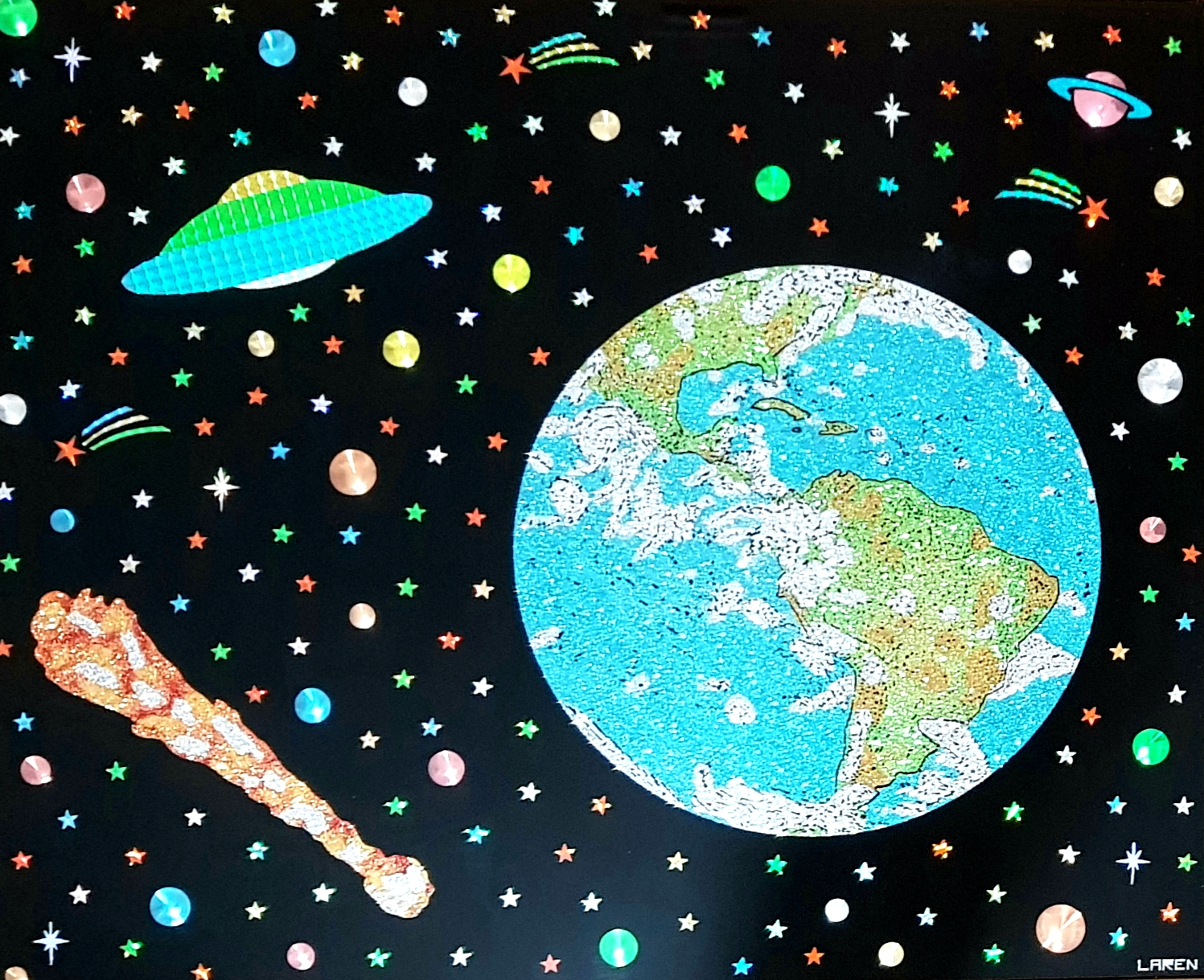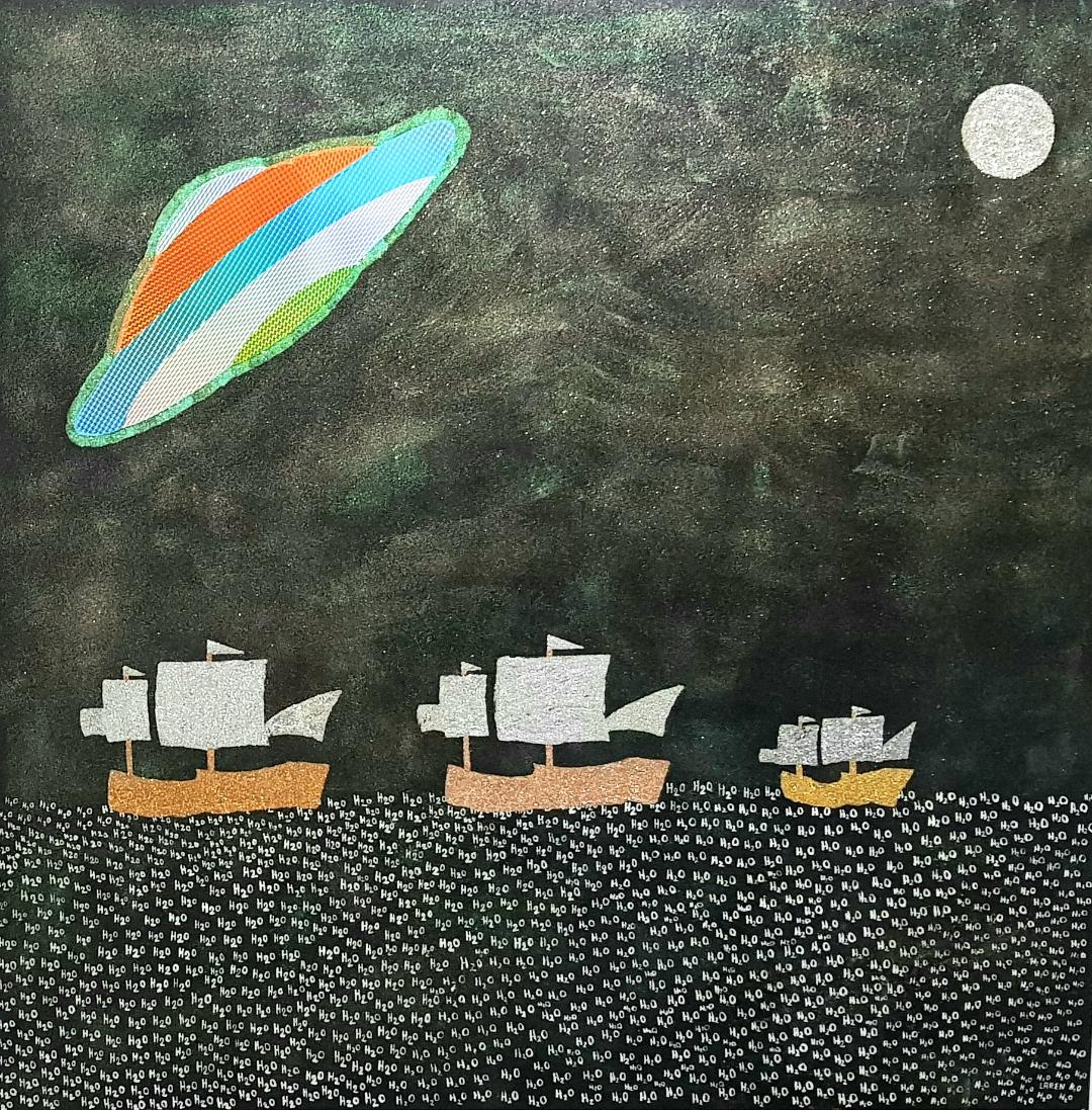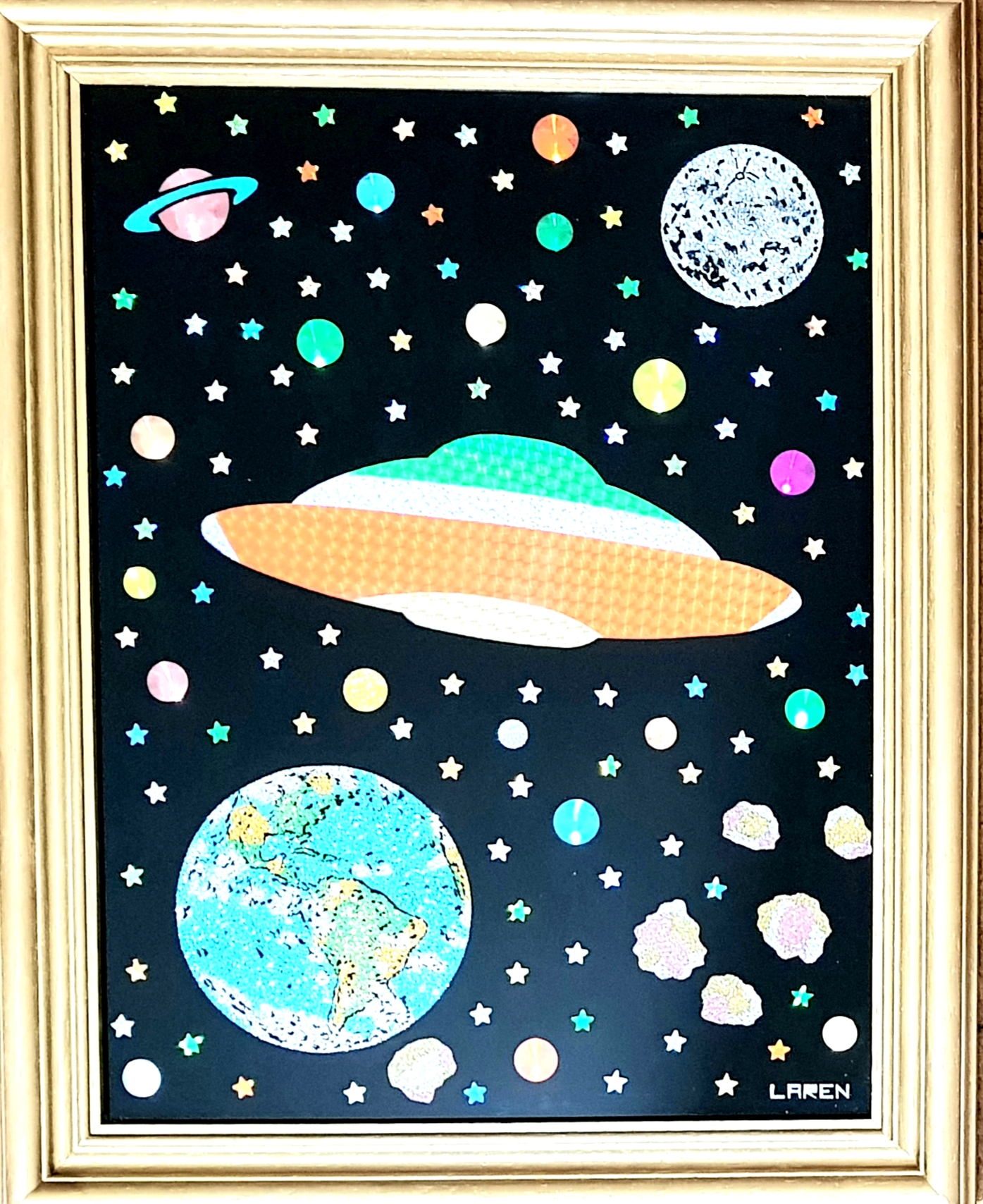 El creador del país imaginario “Larenland”, utiliza una amplia gama de materiales y objetos: resina, esmaltes, purpurina, glitter, vidrio líquido, papel espejo y holográfico, mostacillas, monedas e imágenes. Elementos que, debido a su brillo y su textura, dan a su obra cierta cualidad cinética, ya que cambian según la luz y el ángulo de observación. Elaboró su técnica a partir de su formación en el campo de la química mientras experimentaba con la pintura.