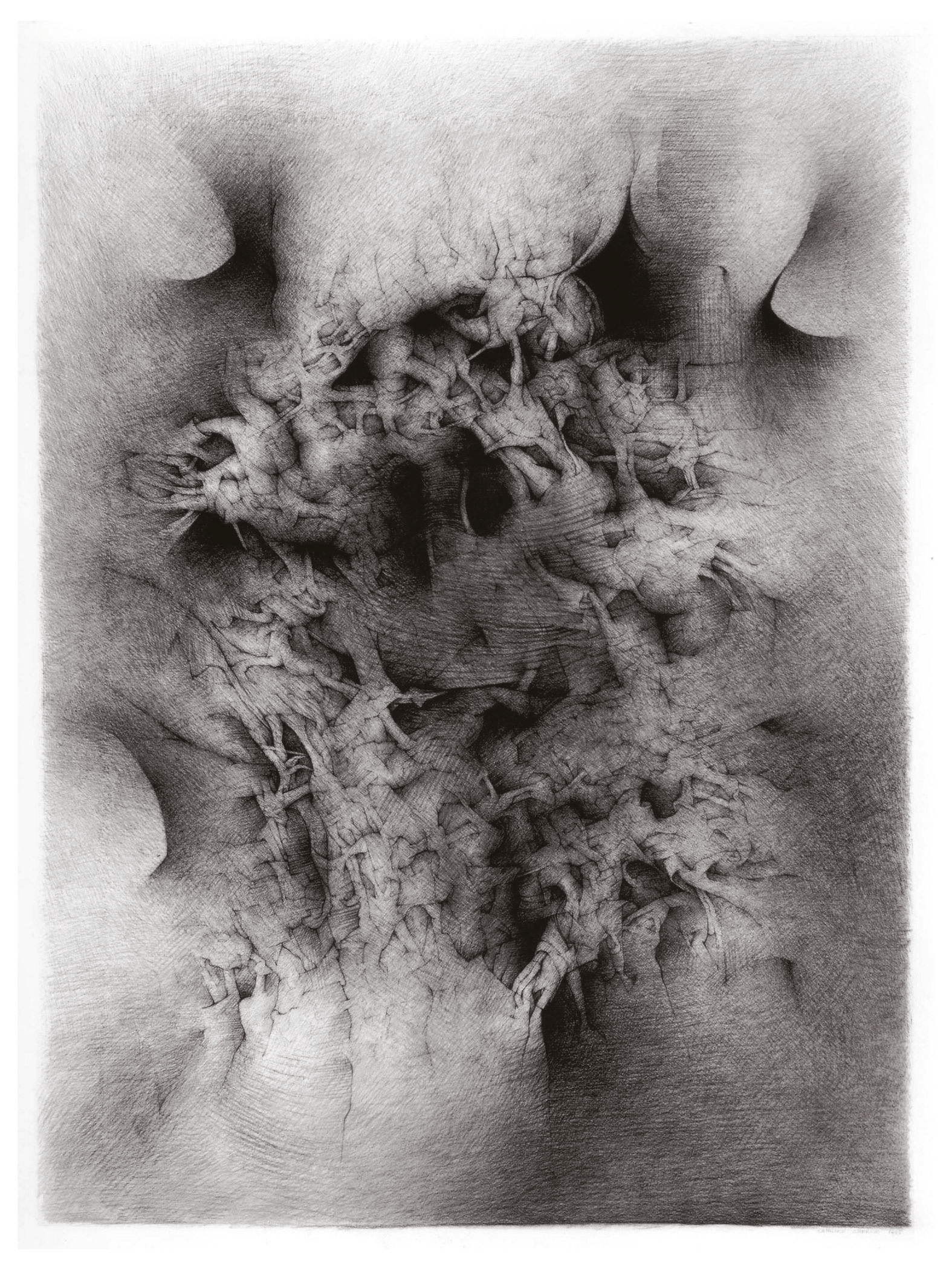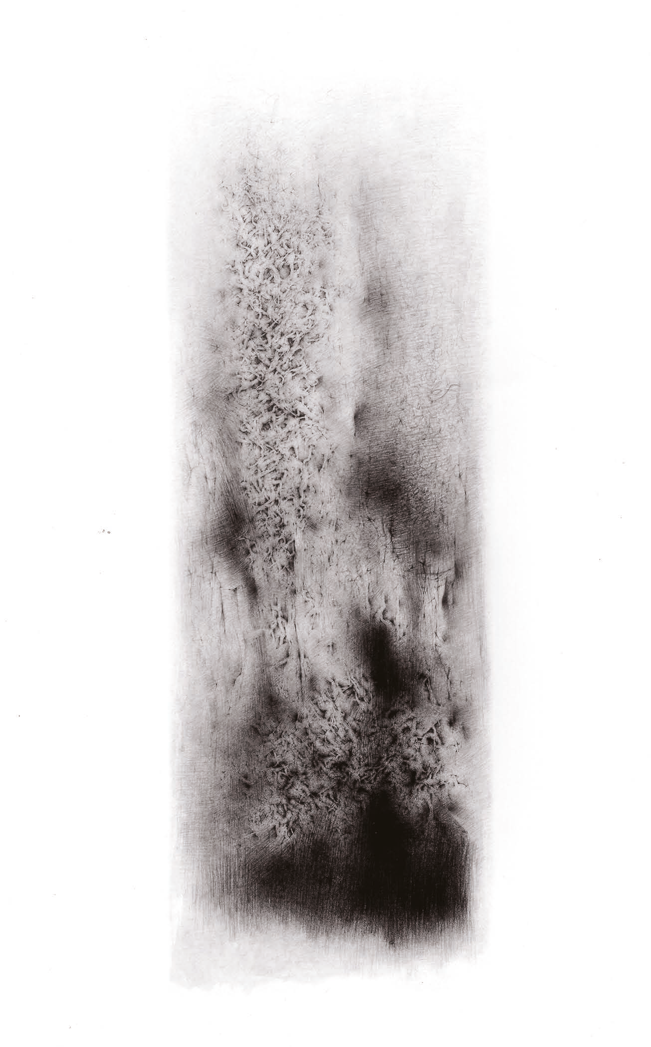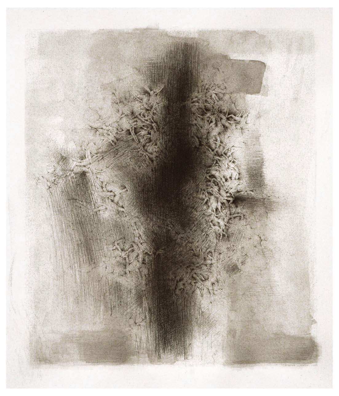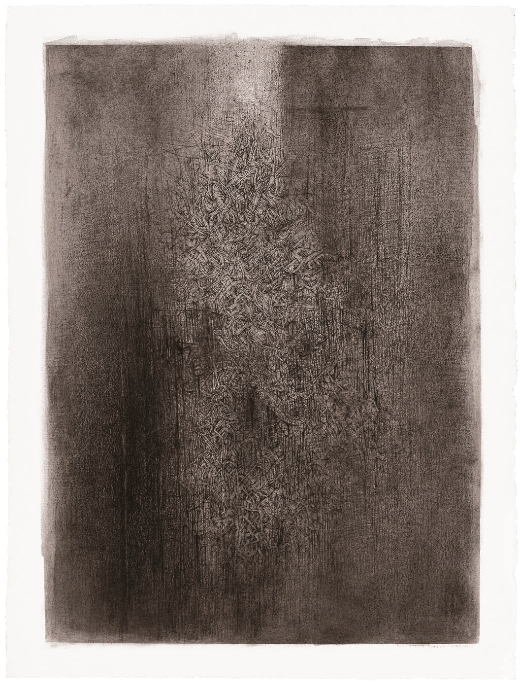 Con pluma, lápiz, tintas y carbón Chervin plasma sobre el papel formas, líneas, manchas que se yuxtaponen y tejen texturas, luces y sombras.