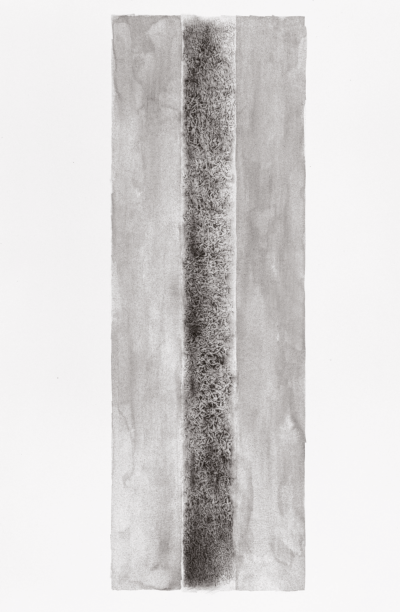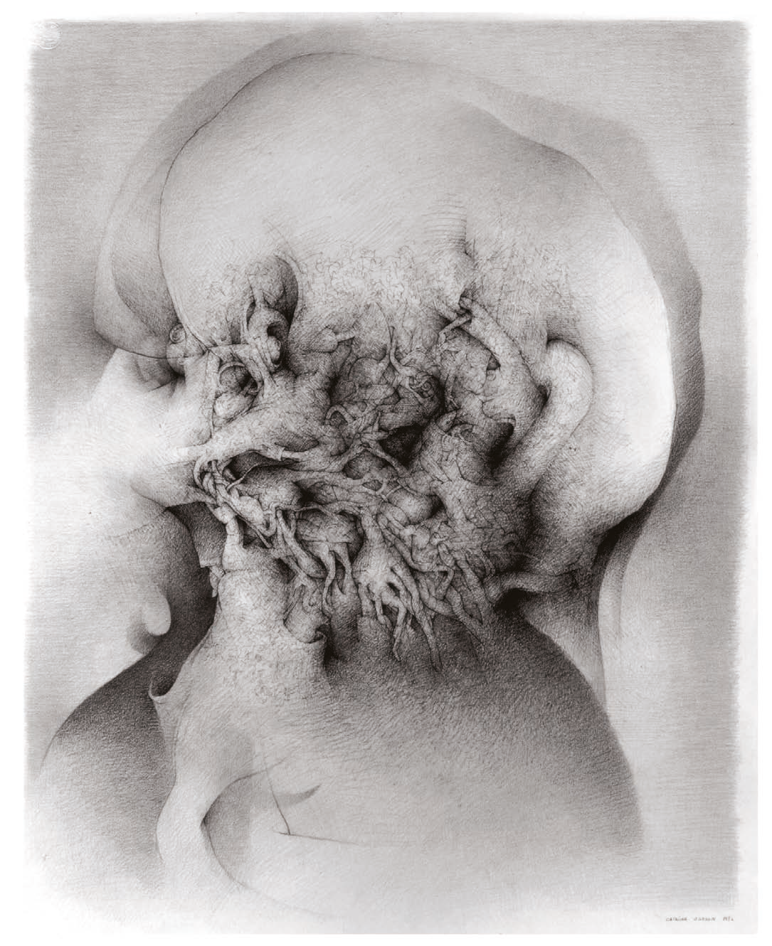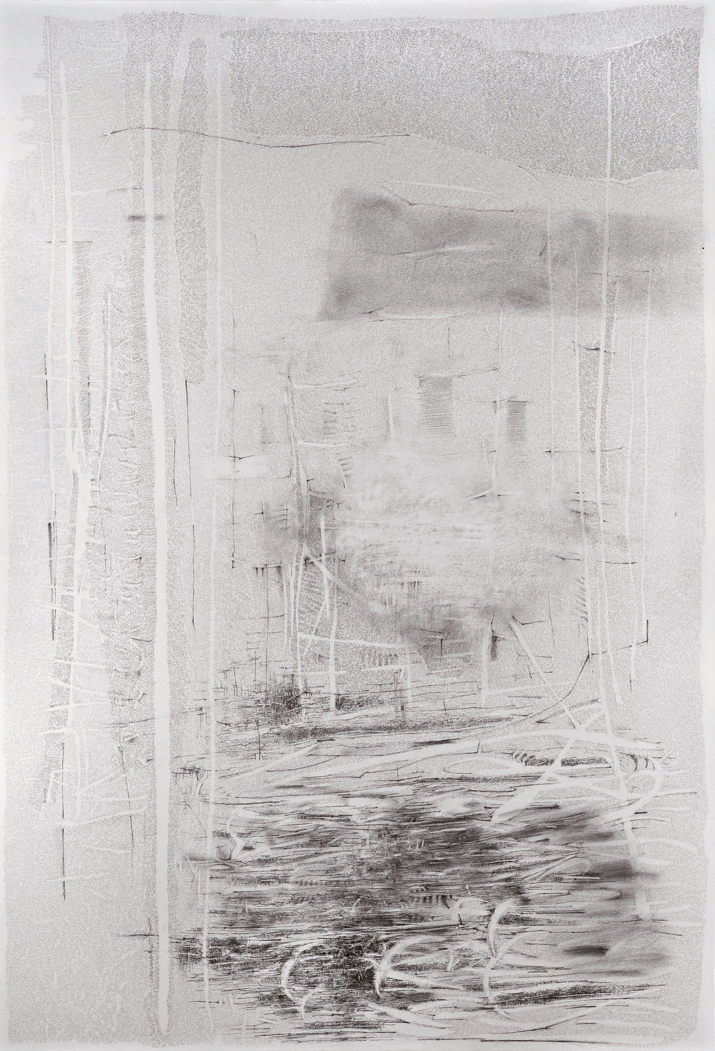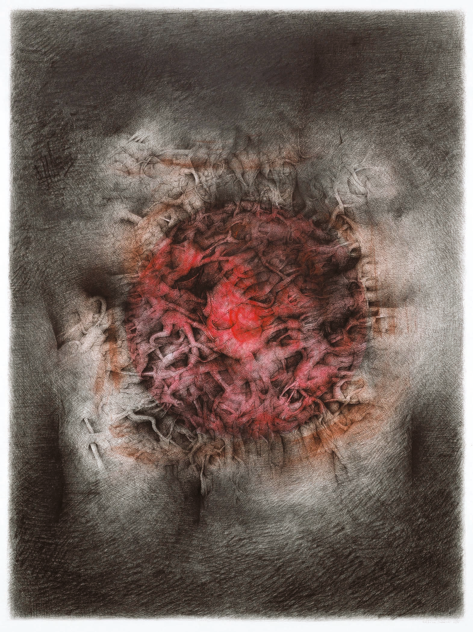 Con pluma, lápiz, tintas y carbón Chervin plasma sobre el papel formas, líneas, manchas que se yuxtaponen y tejen texturas, luces y sombras.