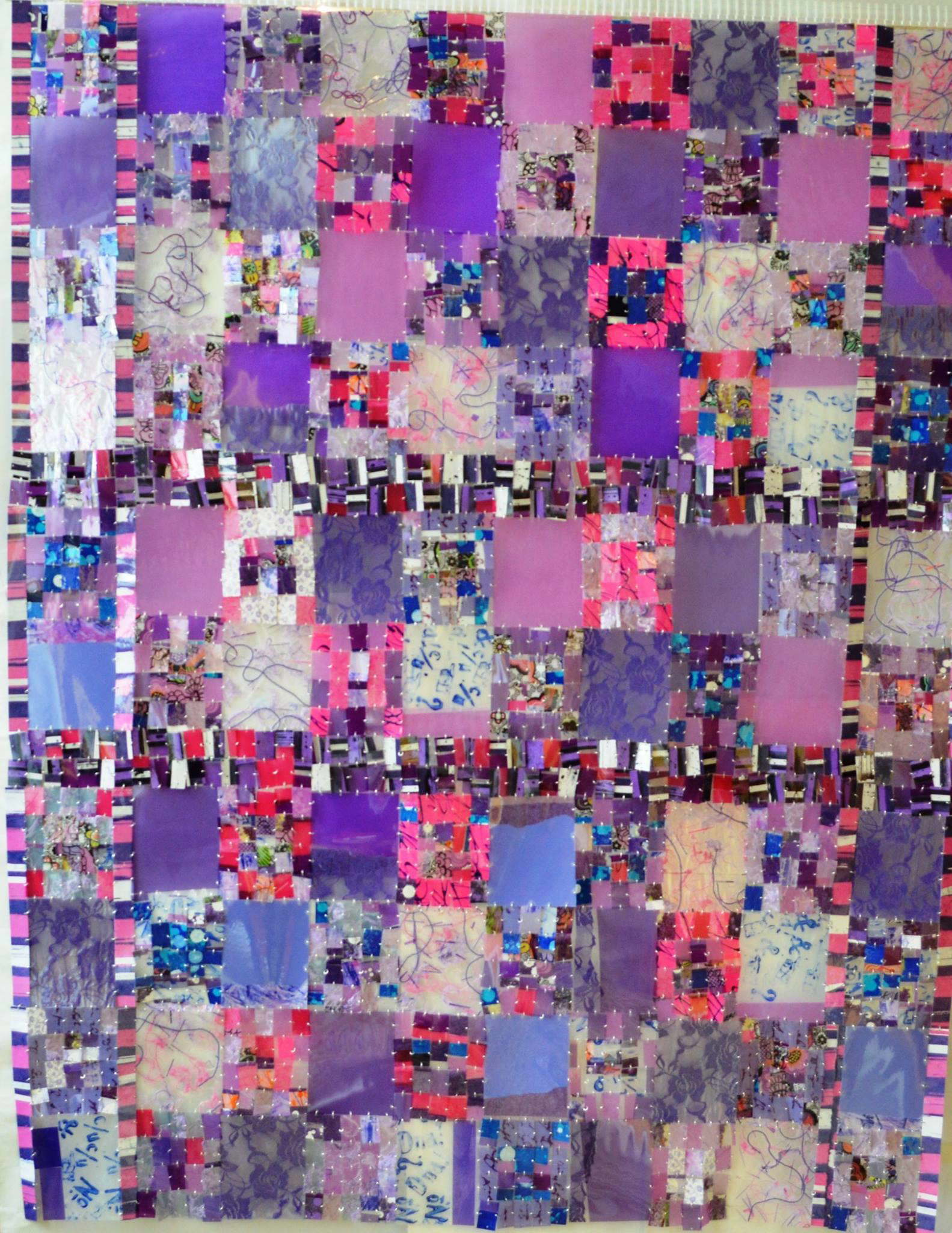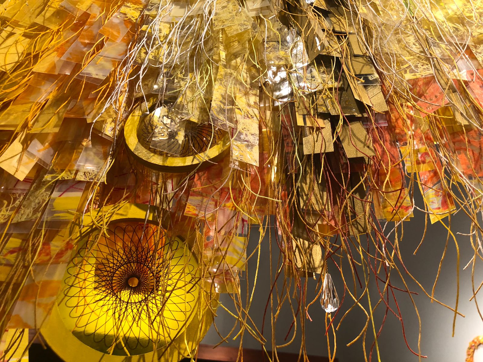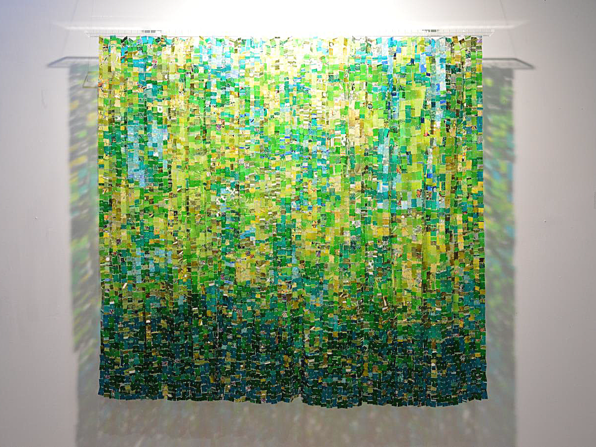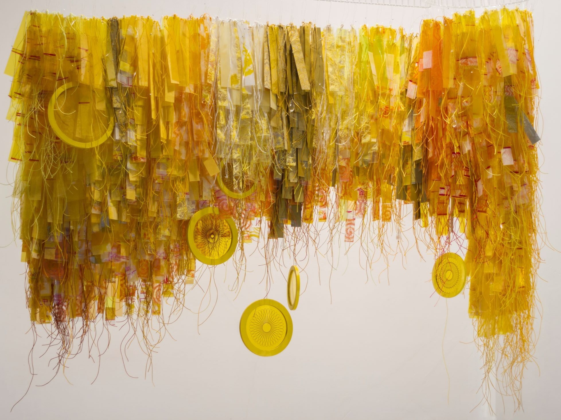 dibujos en papel, trazas de grabado, fibras textiles, pequeños objetos naturales y palabras.