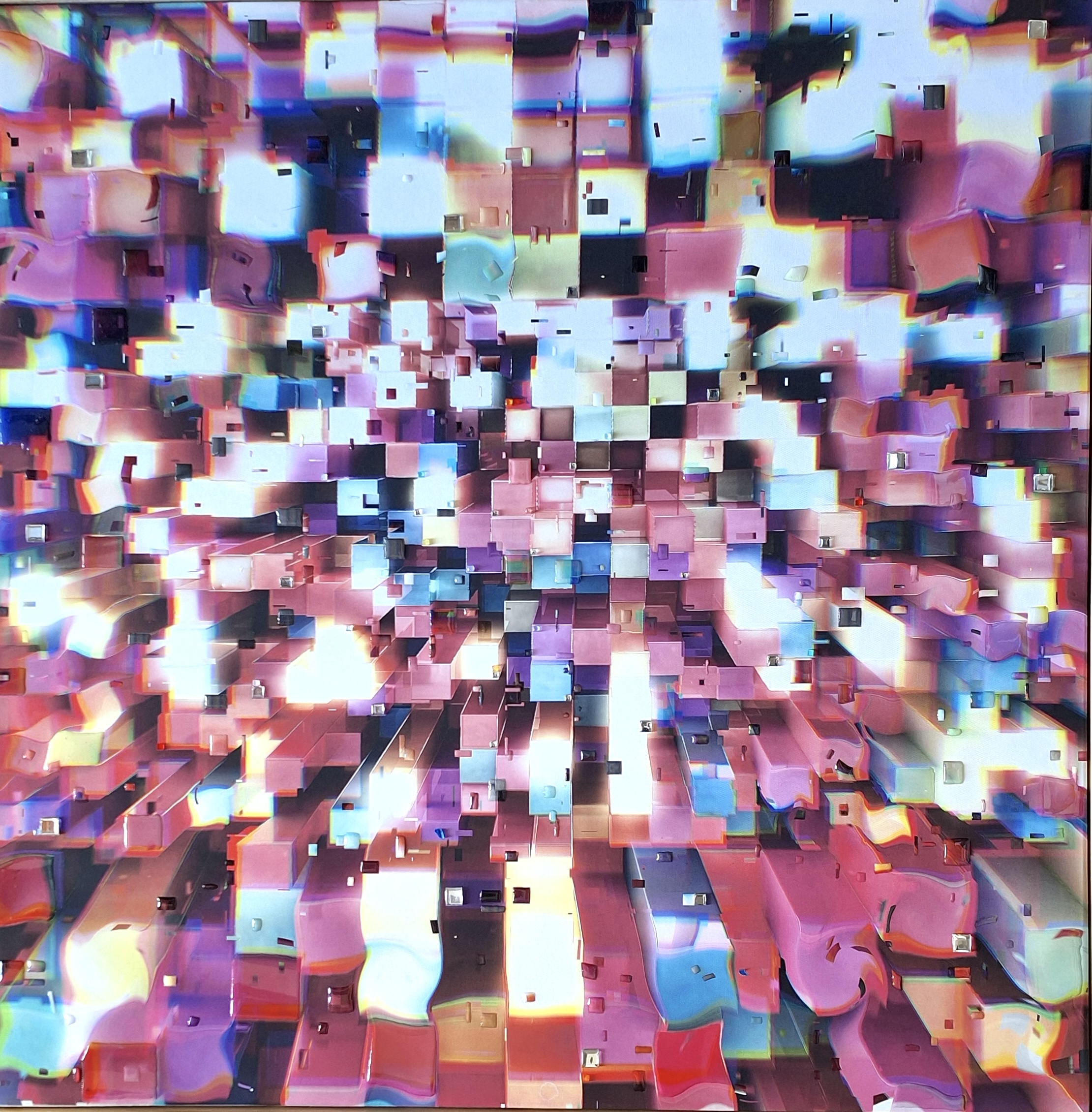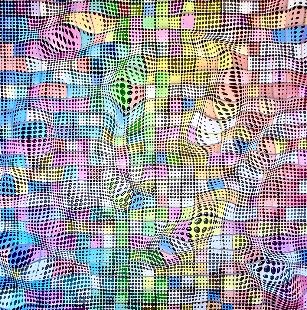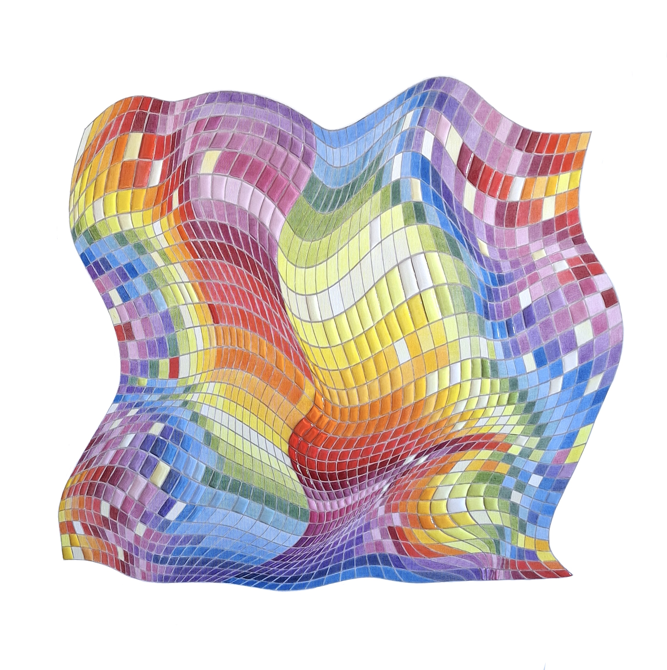 Se destaca por la mezcla entre la geometría cinética digital (evolución) con el dibujo y el color. Crea «formas contenidas de movimiento.»