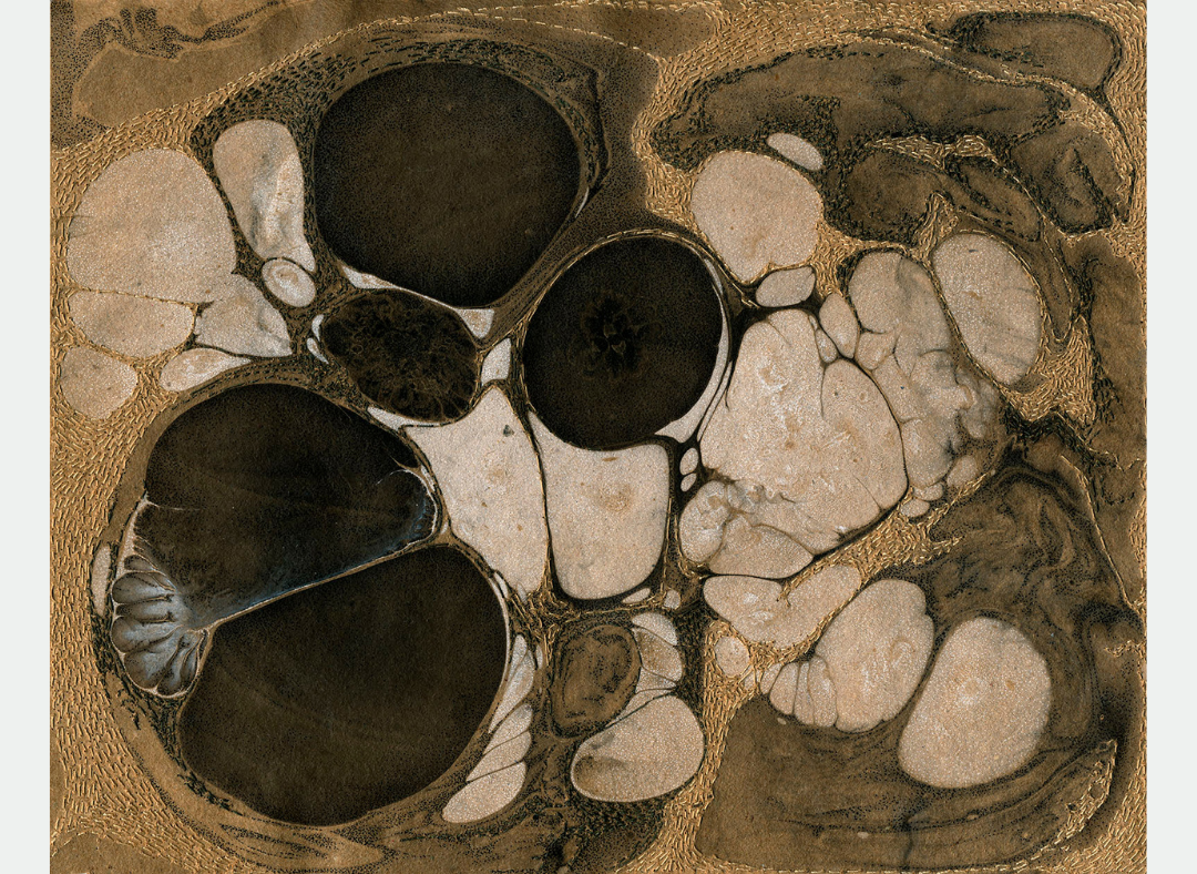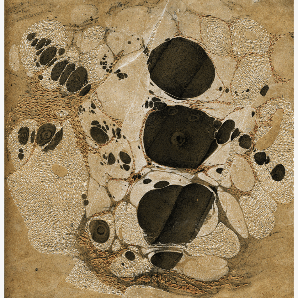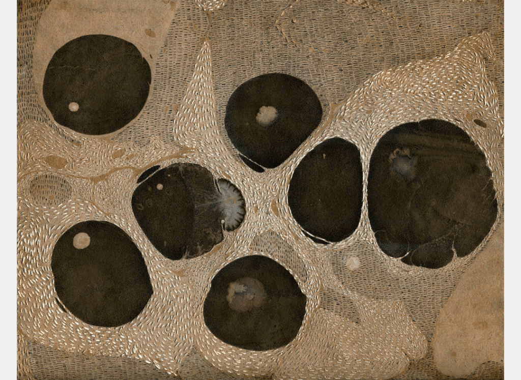 Tinta china, bordado con hilo de algodón sobre papel madera. 35×40 cm. 2021. US$ 1.000