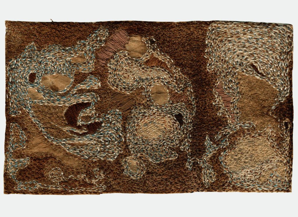 Bordado a mano con hilo de algodón sobre sacos de té usados sobre lienzo, 15×19 cm (sin marco)- 31×24,5cm (con marco) 2020. US$ 700