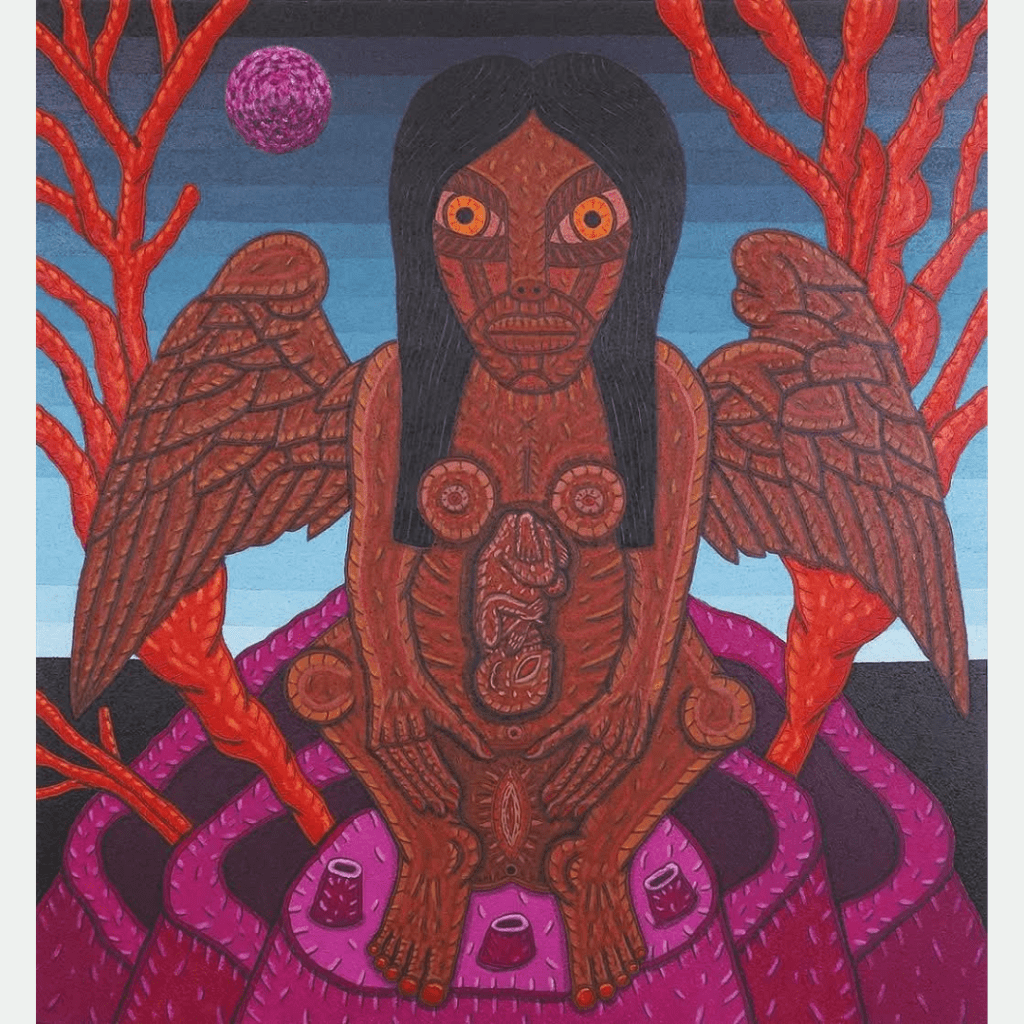Reina serpiente y el nacimiento de la niña volcán. 2020. Acrílico sobre tela. 140 x 130 cm. US$ 11.000