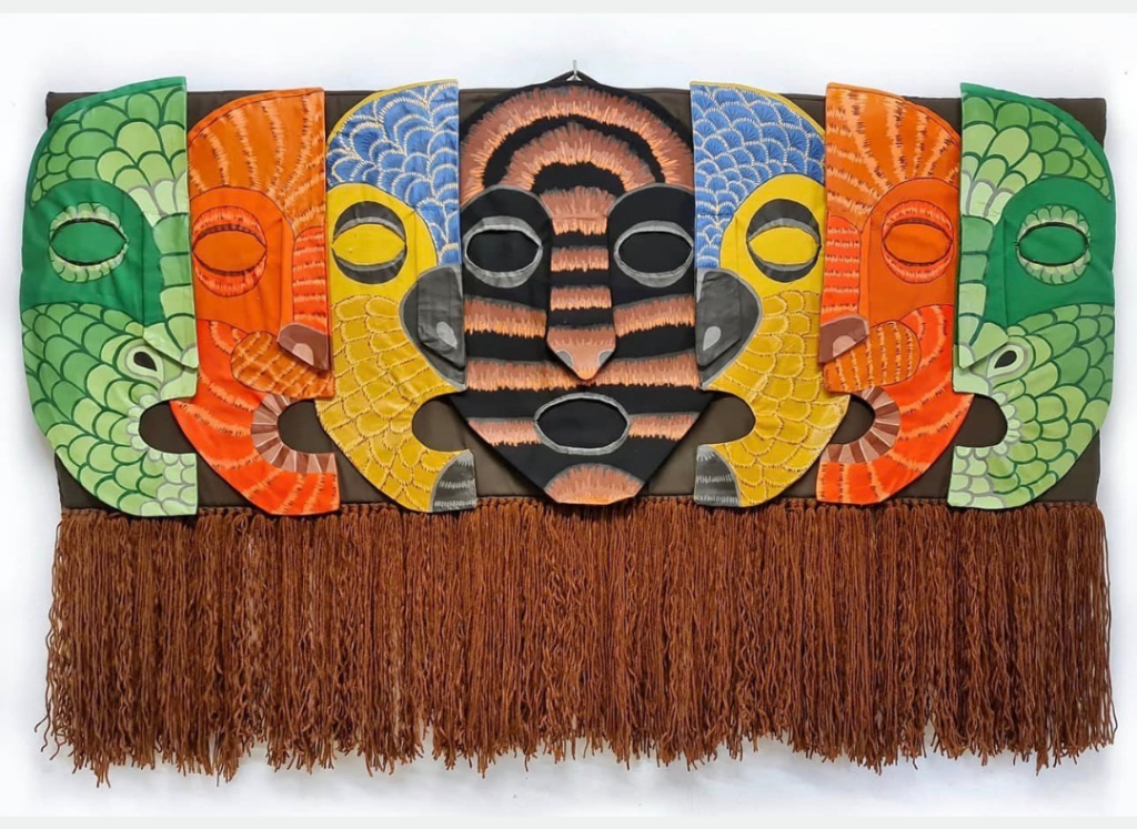 Hombre, ave, jaguar, serpiente. 2020. Pintura sobre piezas realizadas en tela, lana. 150x97cm. US$ 3.700
